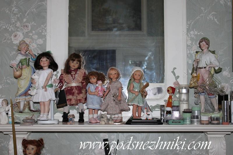…Потом я шью, вяжу... Вот Кае Виггсику старому связала шарфик и шапочку, тоже завеселел! Многим одежку переделывала. Но мне не всех хочется переодевать. Вот приехала ко мне Химштедт, Бонни. Так мне понравилась эта кукла! И я ей столько всего нашила, еще мне подарили. А я потом одела ее в родной костюм - он ей больше всего идет! Что я не приделывала там, она нарядней всего в нем! Сейчас она опять в старом стоит! А некоторым куклам идет новое. Тем же Химштедтам. Иногда у них одежда бывает такого "грязного" цвета. А когда я их переодела в кружева, в белое такое шитье... Ой! Как они захорошели сразу! Просто преобразились! Вот эти, которые у меня стоят в деревенских платьях, в шляпках соломенных... Такие девочки из предместья! Такие "остиновские"!